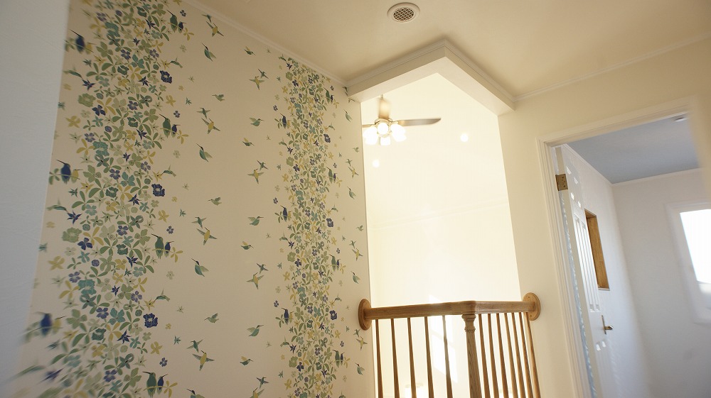 また、ステンドグラス・小鳥モチーフの付いた照明・小鳥柄の壁紙クロス・隠し部屋的なロフトと、