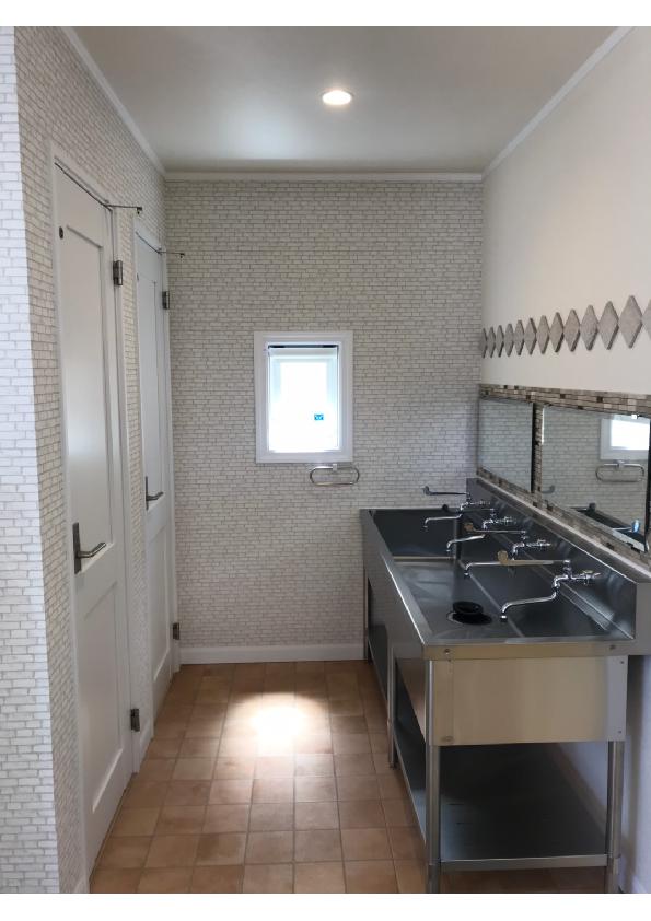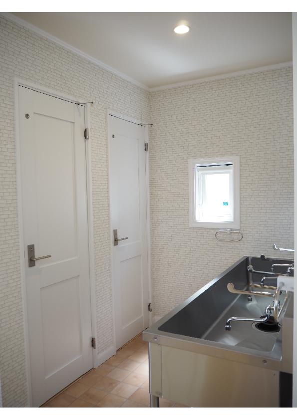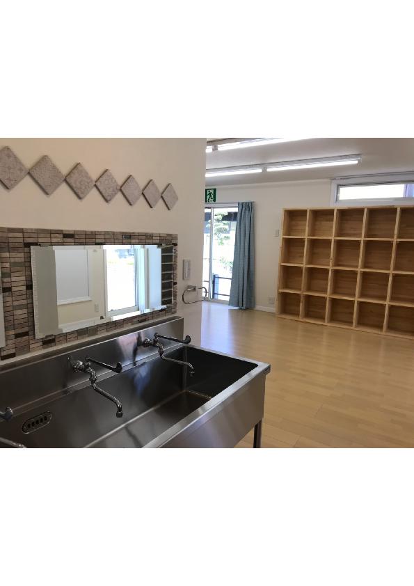 お子様が学校が終わってからや長期休みなどの再に過ごす学童保育所。 ご家族の方も安心して預けて頂ける地震に強い造りの2×4工法の建物。 外観として、道路面のファサードには飾り雨戸などの可愛い装飾品を用いました。 内部は大空間のスペースが1階2階とあり、洗面スペースにはこだわりのタイルがダイヤ型に貼ってあり、可愛いポイントになっています。 【非住宅:学童保育所(2階建) 施工面積:111.38㎡(33.69坪)】